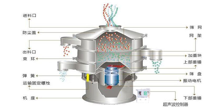 超聲波振動(dòng)篩有進(jìn)料口,篩網(wǎng),防塵蓋,網(wǎng)架,出料口束環(huán),加重塊,彈簧,機(jī)座,振動(dòng)電機(jī),下部重錘,超聲波控制器等部件。